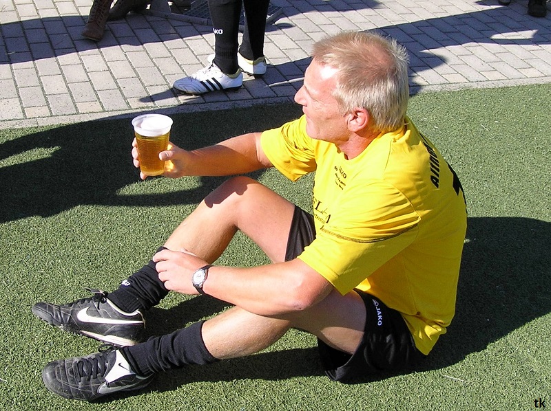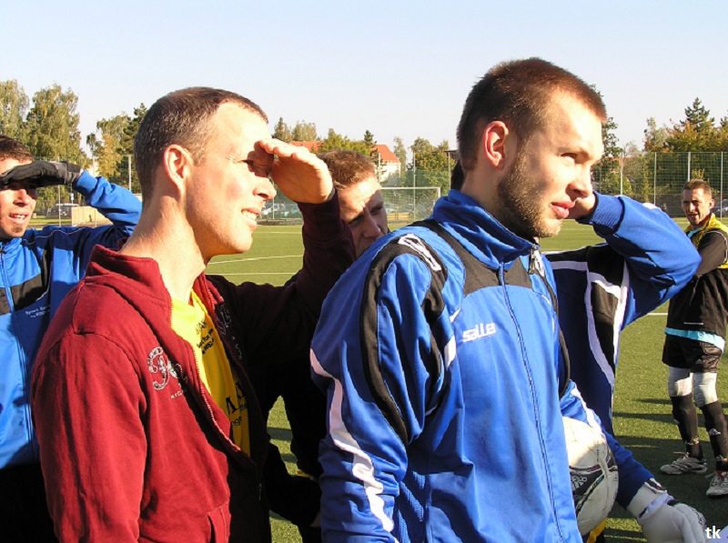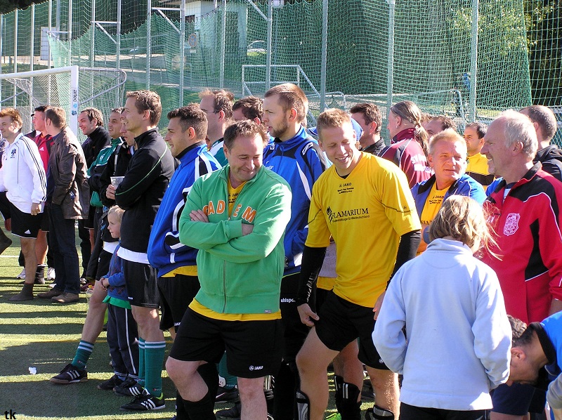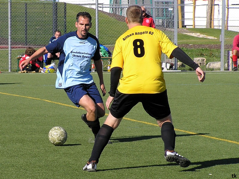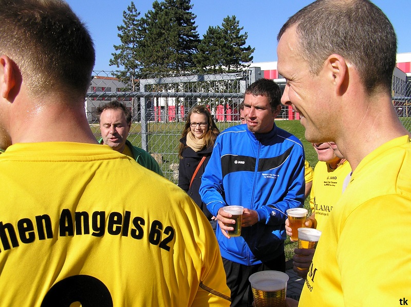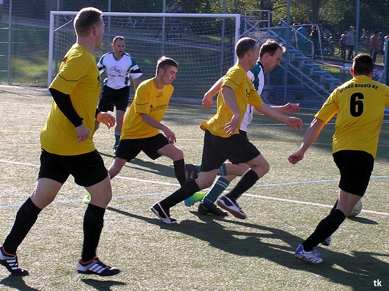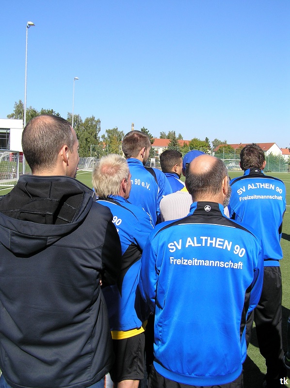 Mit neun Spielern ging es also am Tag der Deutschen Einheit nach Borna, ins Rudolf-Harbig- Stadion zum Fußball-Zwiebelturnier des VSV 77 Borna. Wie wir es gewohnt sind, mal wieder strahlender Sonnenschein, wenn Engel verreisen. Nach der Erwärmung hatte man sich auch schnell an den Kunstrasen gewöhnt. Beim Beobachten der anderen Mannschaften kam man schon ins Grübeln. Sind wir hier richtig ? Haben wir uns im Stadion geirrt? Das waren keine Thekenmannschaften, die Kollegen wirkten recht eingespielt, ausgeglichen besetzt und körperlich überlegen. Jetzt hatten die Althen Angels genau drei Möglichkeiten : 1. Sich unter den Teilnehmern, beim gleichzeitig stattfindenden Volkssportlauf, zu verstecken. 2. Rumjammern, Ningeln und eine Klatsche nach der anderen abholen. 3. Kämpfen, positiv denken und die eigenen Möglichkeiten erkennen und ausschöpfen.