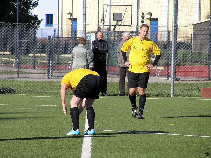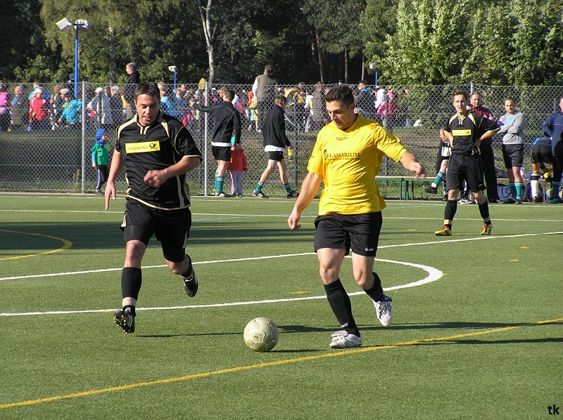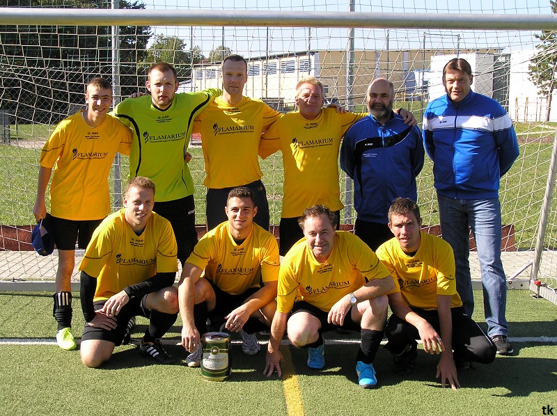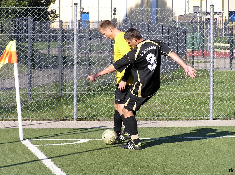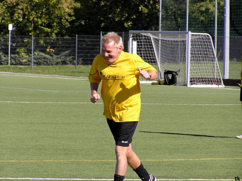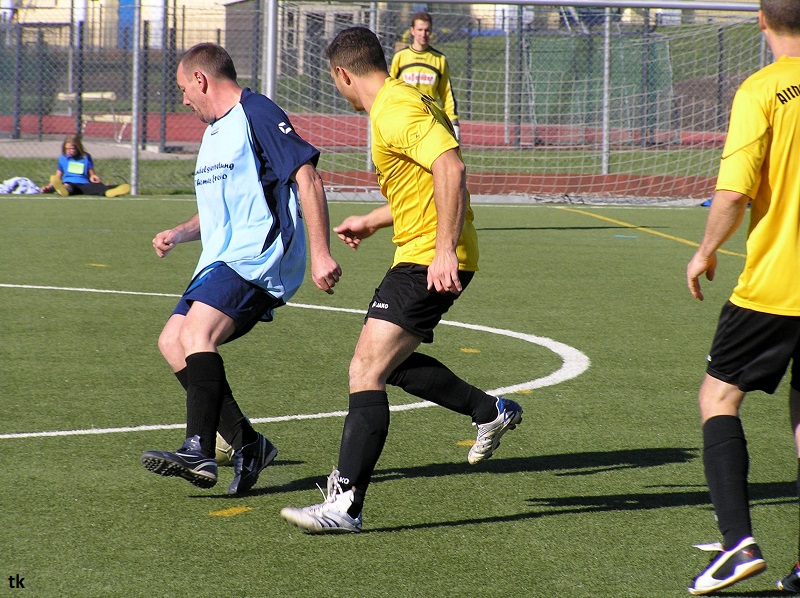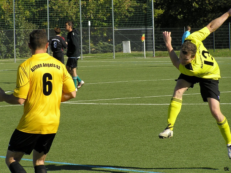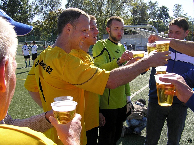 Mit neun Spielern ging es also am Tag der Deutschen Einheit nach Borna, ins Rudolf-Harbig- Stadion zum Fußball-Zwiebelturnier des VSV 77 Borna. Wie wir es gewohnt sind, mal wieder strahlender Sonnenschein, wenn Engel verreisen. Nach der Erwärmung hatte man sich auch schnell an den Kunstrasen gewöhnt. Beim Beobachten der anderen Mannschaften kam man schon ins Grübeln. Sind wir hier richtig ? Haben wir uns im Stadion geirrt? Das waren keine Thekenmannschaften, die Kollegen wirkten recht eingespielt, ausgeglichen besetzt und körperlich überlegen. Jetzt hatten die Althen Angels genau drei Möglichkeiten : 1. Sich unter den Teilnehmern, beim gleichzeitig stattfindenden Volkssportlauf, zu verstecken. 2. Rumjammern, Ningeln und eine Klatsche nach der anderen abholen. 3. Kämpfen, positiv denken und die eigenen Möglichkeiten erkennen und ausschöpfen.