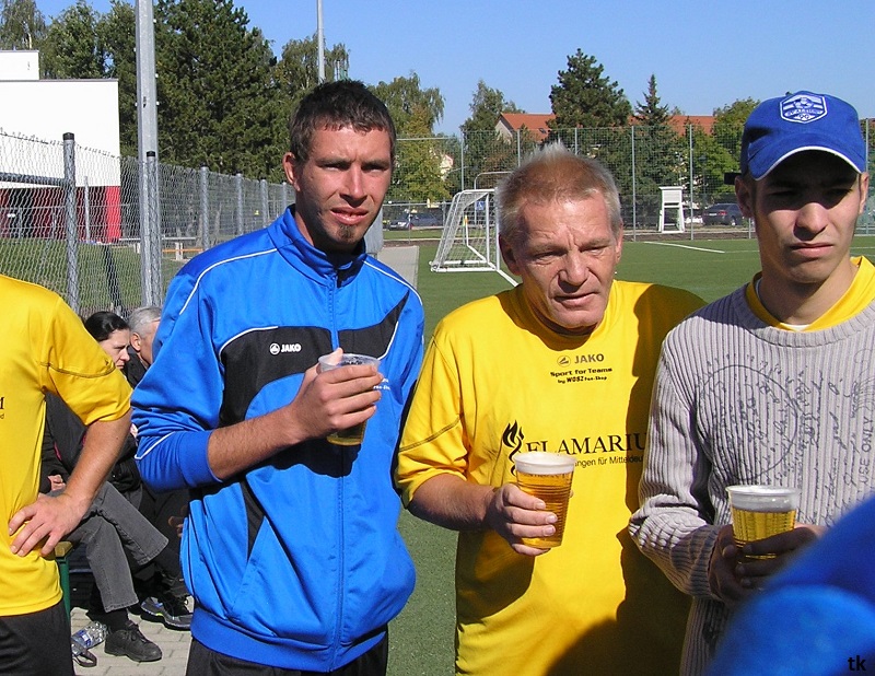 Mit neun Spielern ging es also am Tag der Deutschen Einheit nach Borna, ins Rudolf-Harbig- Stadion zum Fußball-Zwiebelturnier des VSV 77 Borna. Wie wir es gewohnt sind, mal wieder strahlender Sonnenschein, wenn Engel verreisen. Nach der Erwärmung hatte man sich auch schnell an den Kunstrasen gewöhnt. Beim Beobachten der anderen Mannschaften kam man schon ins Grübeln. Sind wir hier richtig ? Haben wir uns im Stadion geirrt? Das waren keine Thekenmannschaften, die Kollegen wirkten recht eingespielt, ausgeglichen besetzt und körperlich überlegen. Jetzt hatten die Althen Angels genau drei Möglichkeiten : 1. Sich unter den Teilnehmern, beim gleichzeitig stattfindenden Volkssportlauf, zu verstecken. 2. Rumjammern, Ningeln und eine Klatsche nach der anderen abholen. 3. Kämpfen, positiv denken und die eigenen Möglichkeiten erkennen und ausschöpfen.
